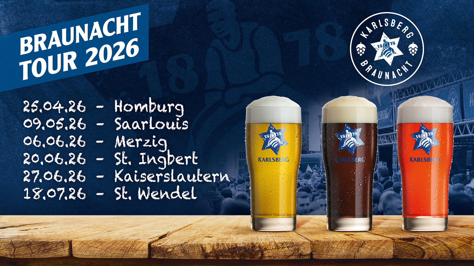 Der Startschuss fällt am 25. April in Homburg, bevor die Braunacht weiterzieht nach Saarlouis, Merzig, St. Ingbert, Kaiserslautern und St. Wendel. Sechs Städte, sechs Abende, unzählige Begegnungen – und überall heißt es: Gemeinsam genießen, feiern und anstoßen!